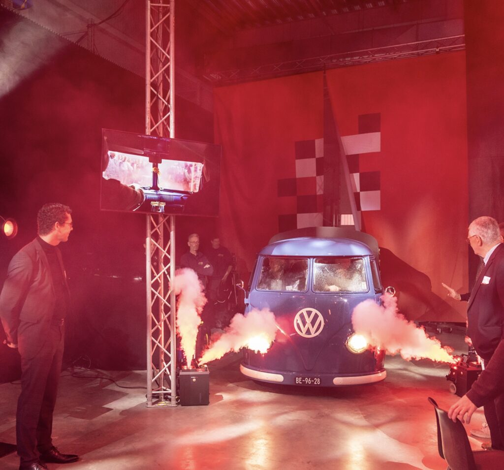 Voor Bouwgroep Schrijver hebben we een gordijn geproduceerd waar een ontzettend mooie oude volkswagen bus doorheen is gereden. De foto (gemaakt door opbeeld.nl) spreekt boekdelen.